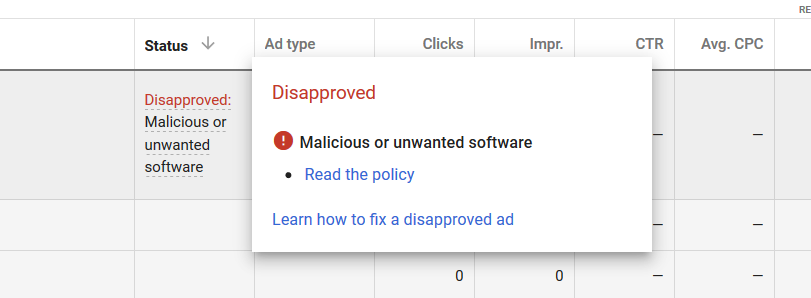 why disapproved my adwords ad with this massage malicious or unwanted software google ads community