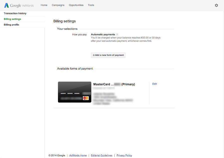 google adwords change payment method