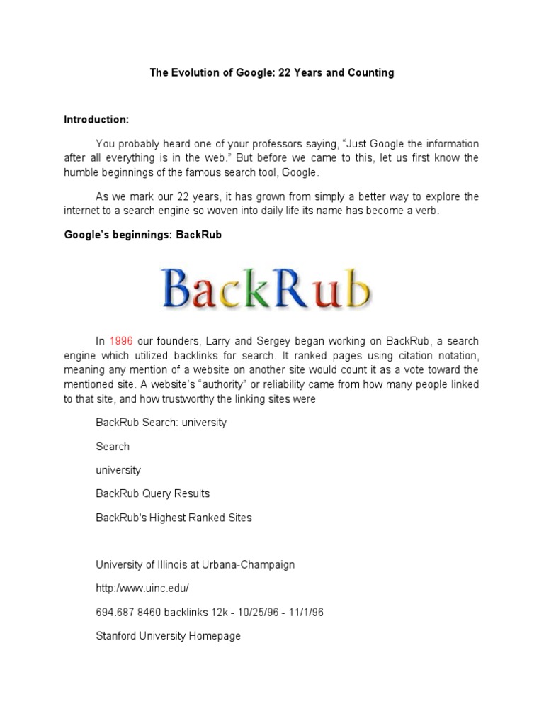 Google backrub. In this paper we present google a prototype of a large scale search engine which makes heavy use of the structure present in hypertext. Was officially launched in 1998 by larry page and sergey brin to market google search which has become the most used web based search engine larry page and sergey brin students at stanford university in california developed a search algorithm at first known as backrub in 1996 with the help of scott hassan and alan steremberg the search engine soon proved successful and the. Lawrence edward page born march 26 1973 is an american computer scientist and internet entrepreneur he is best known as one of the co founders of google along with sergey brin.
